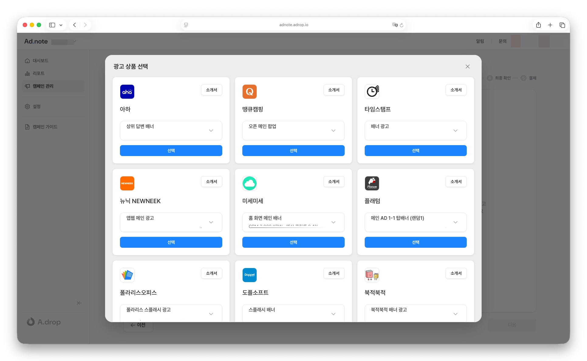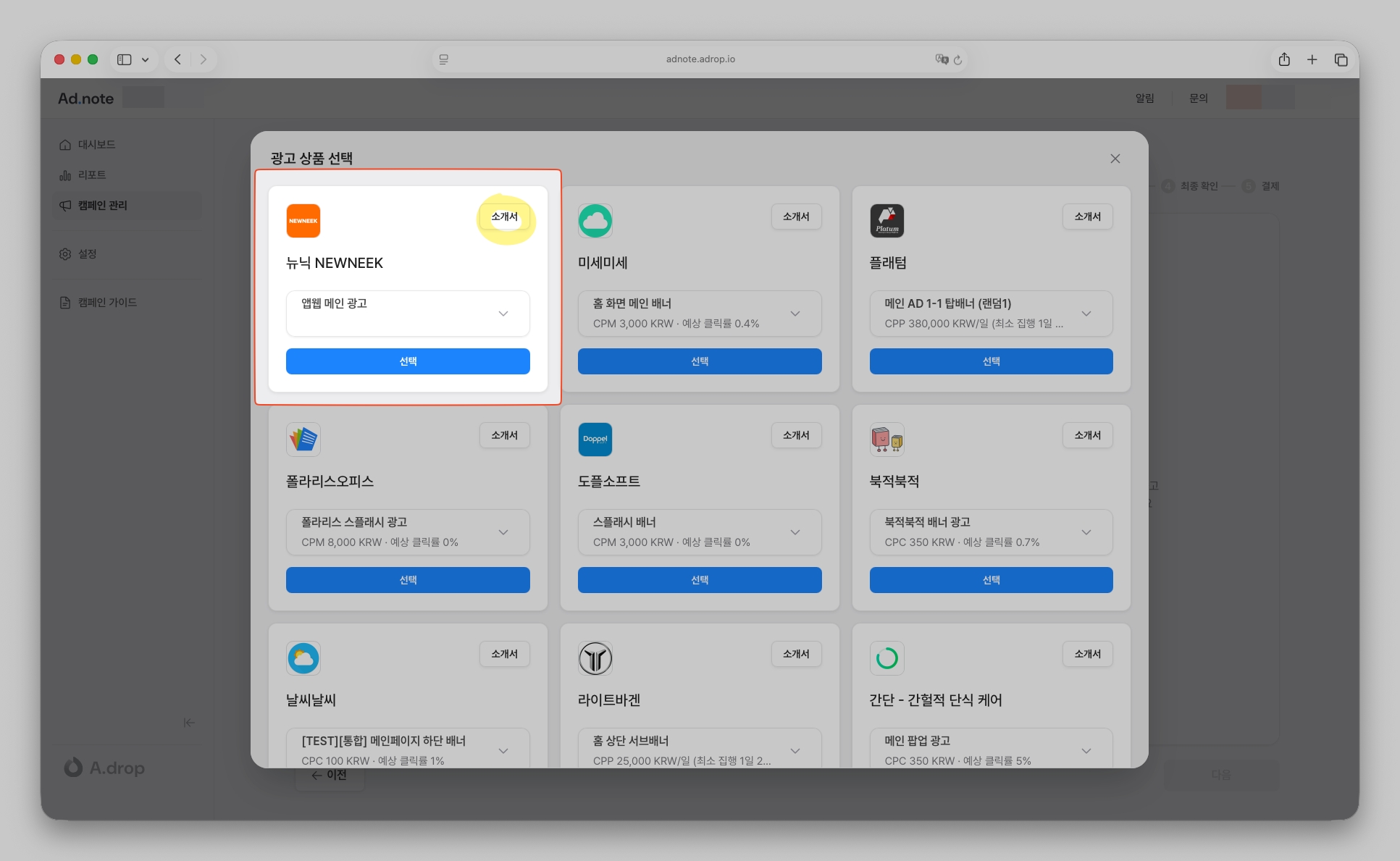 애드노트에서 캠페인을 시작하면, 아래와 같이 바로 예약 가능한 매체들을 확인할 수 있는데요. 매체별 광고 상품을 예상 성과와 함께 바로 비교 및 선택이 가능합니다.