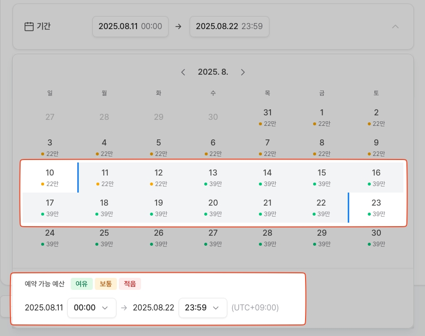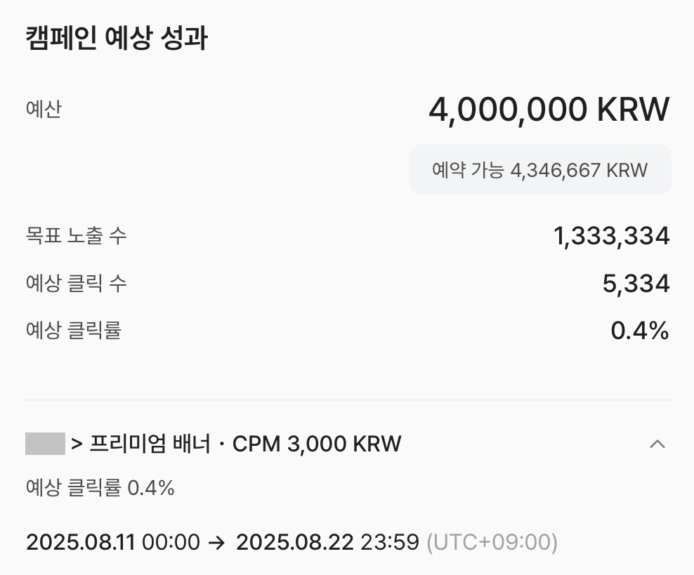 애드노트에서 광고 상품을 찾아 캠페인을 생성하면, 기간과 예산 설정에 따라 노출 수와 클릭 수 등이 어떻게 나타날지 미리볼 수 있어요. 기간에서는 상세 일자별 잔여 구좌도 확인할 수 있답니다.