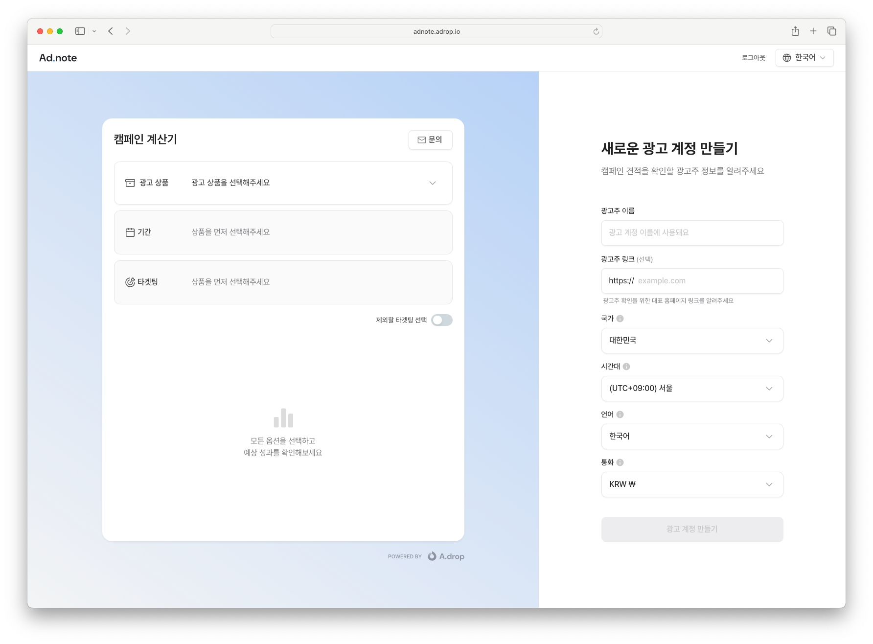Step 1. 신규 계정 생성을 위해 광고주 이름 등 필수 내용을 입력하세요.