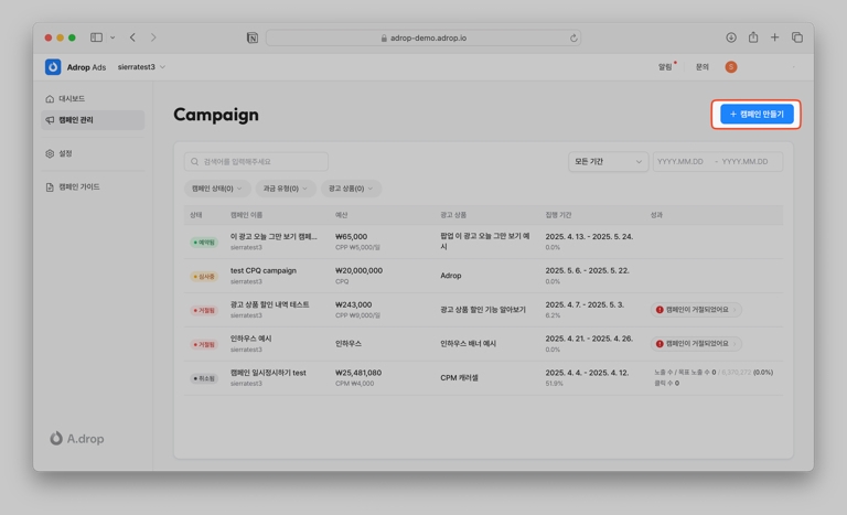 캠페인 관리에서 생성된 캠페인 확인이 가능해요.