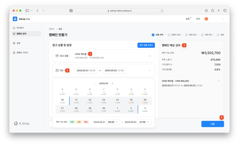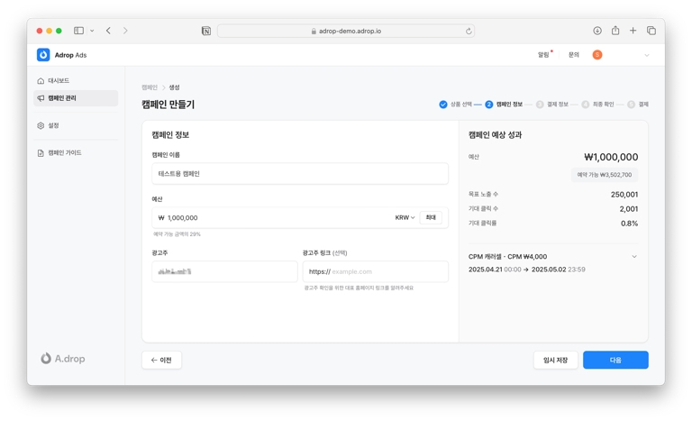 캠페인 예상 성과를 확인하고, ‘다음’ 선택하세요.