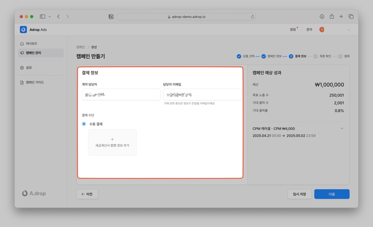 Step 5. 캠페인 정보 입력 후 ‘다음’을 선택하세요.