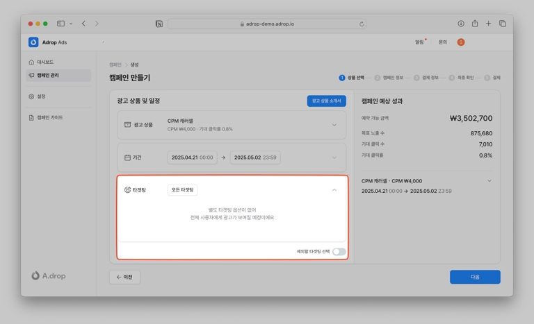 타겟팅 설정을 하지 않을 경우 모든 타겟팅으로 광고가 노출돼요.