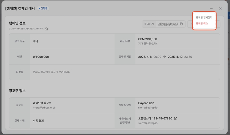 캠페인 일시정지 또는 캠페인 취소를 선택하고 안내된 이메일로 문의해주세요.