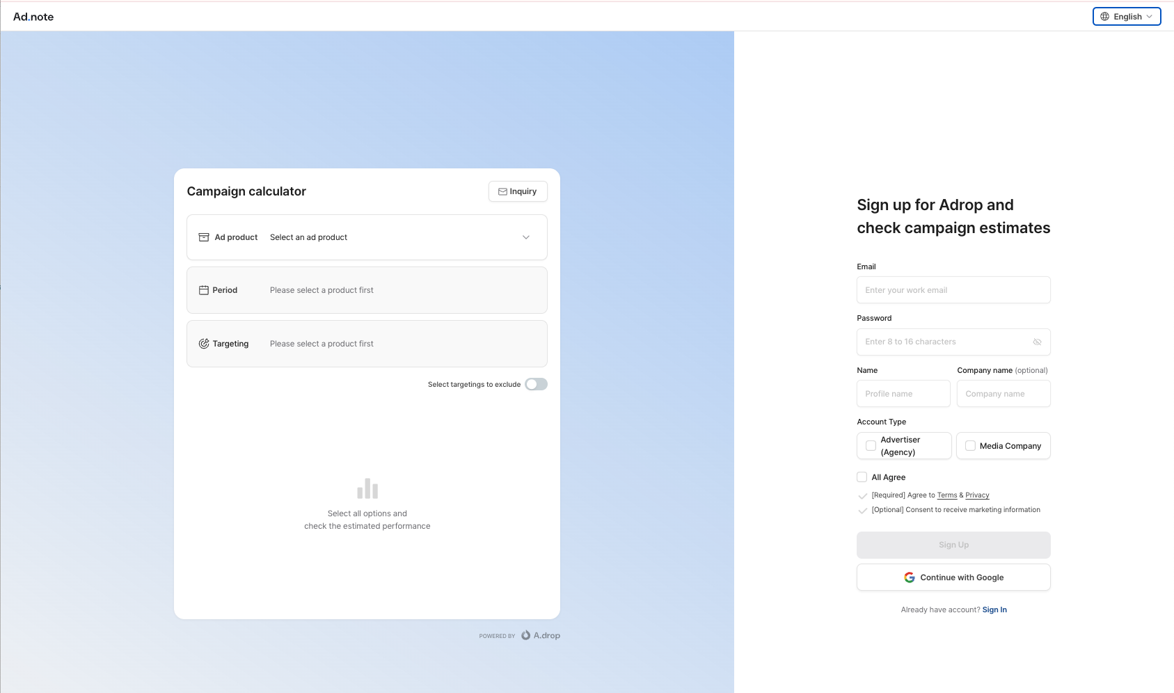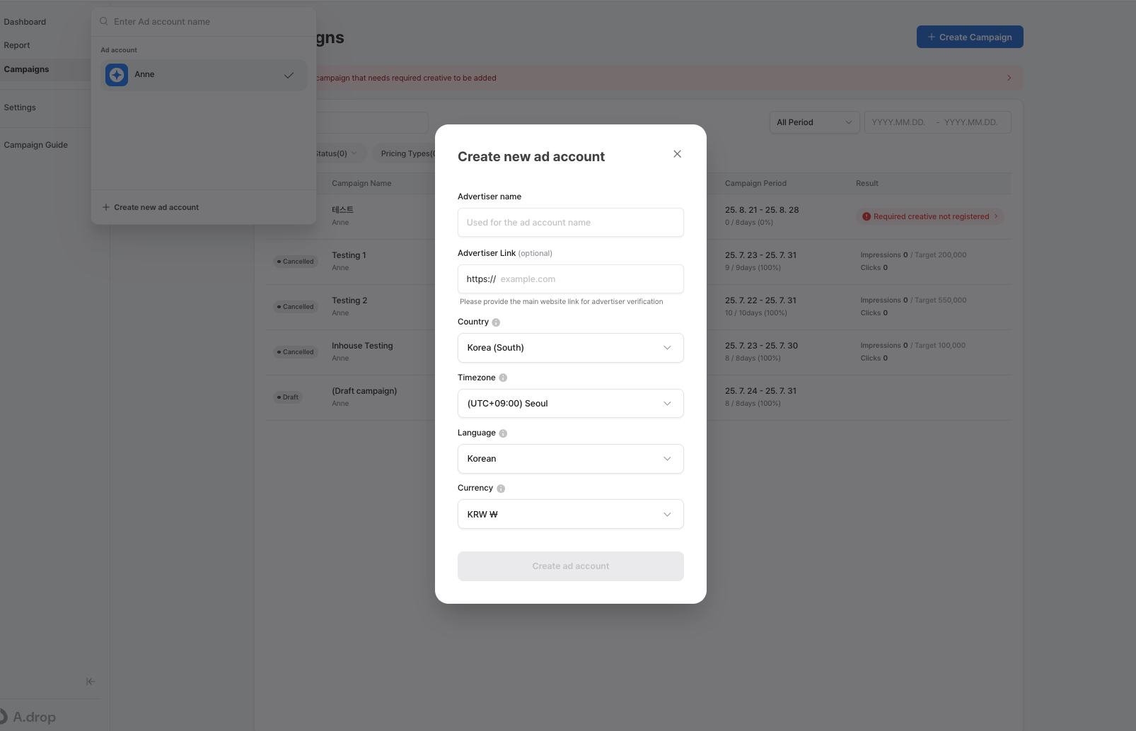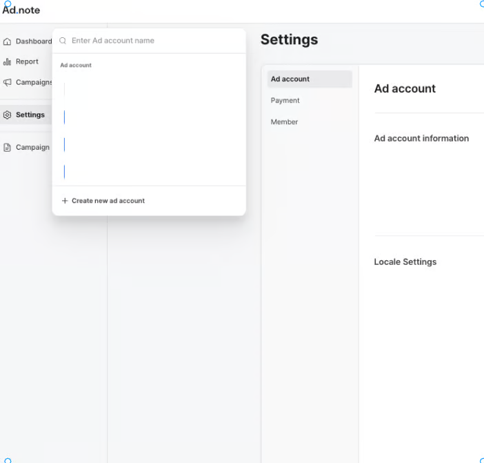 If you’d like to manage multiple campaigns separately within your existing Adrop account, you can create an additional ad account. Here's how: