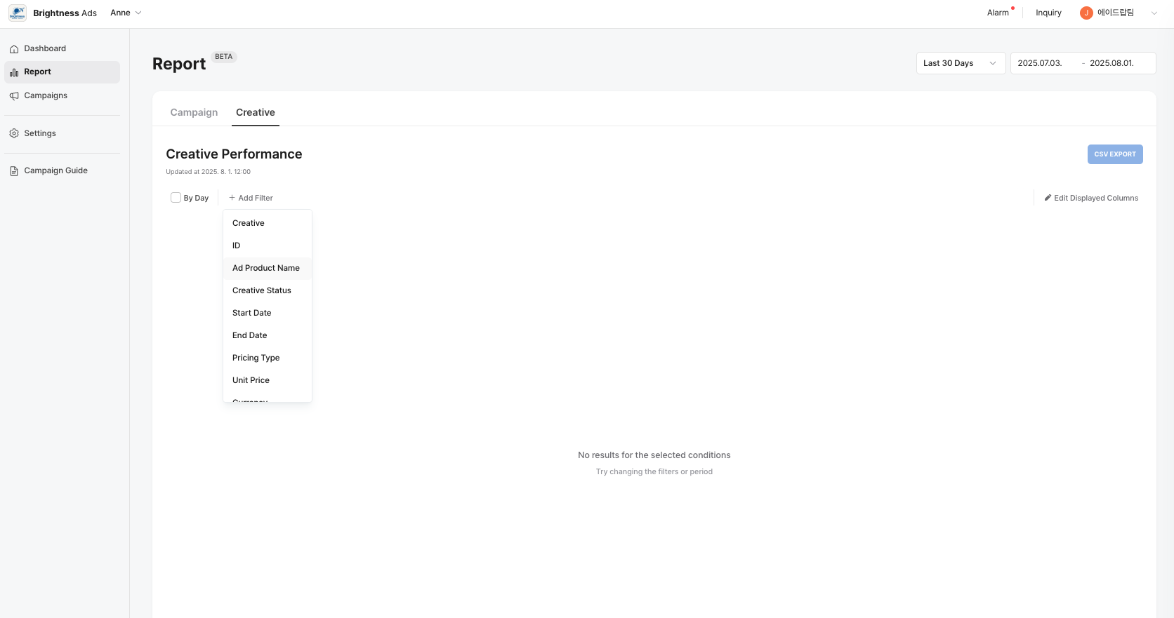 You can view the performance data focused specifically on individual **creatives** across your campaigns. This helps advertisers analyze which creative assets are delivering results and which may need improvement.