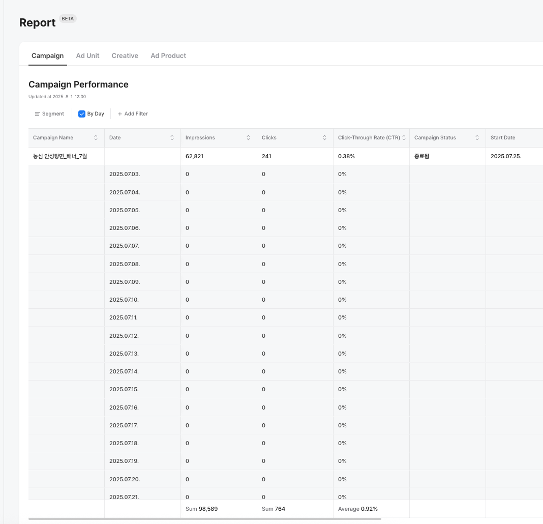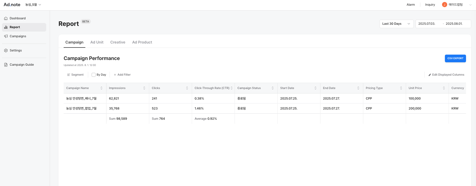 The Report tab allows you to view detailed performance data for your campaigns.