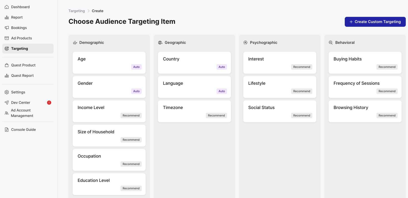 (For more details, check the [**Targeting Creation Guide**](https://app.gitbook.com/o/DNjv21WkV2yAaUCneXKU/s/dbXqzAGZzRMkuFk2wG7Q/audience-targeting-overview/creating-audience-targeting).)