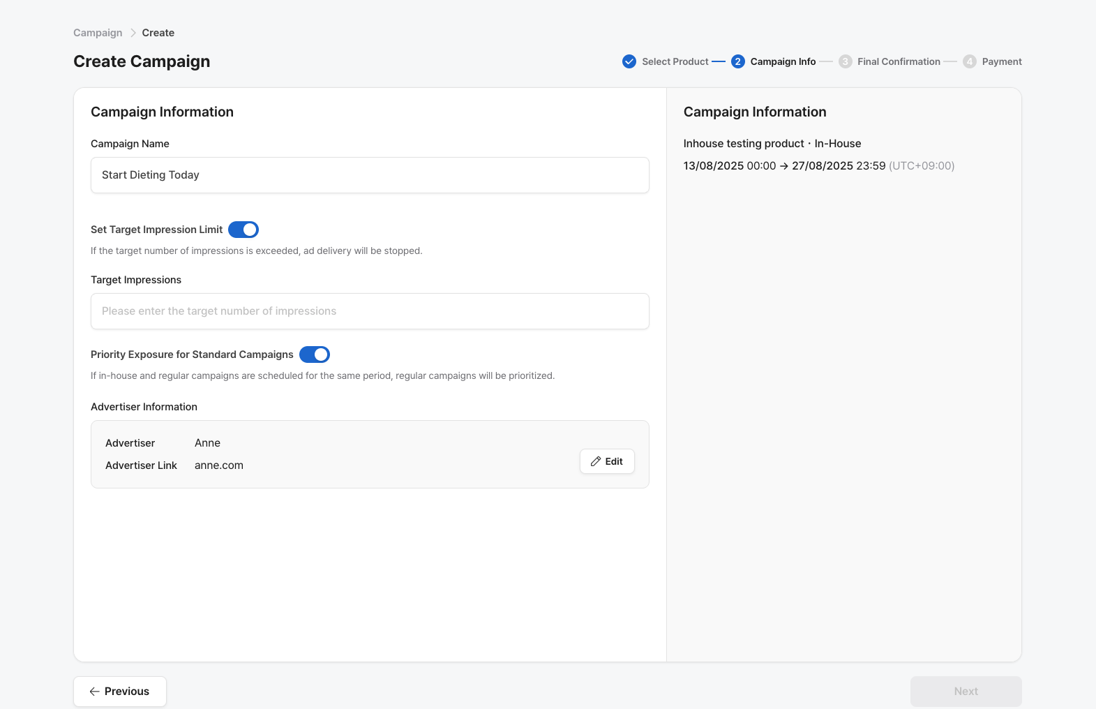 4. Enter the basic campaign information such as advertiser's name, schedule, and target metrics.