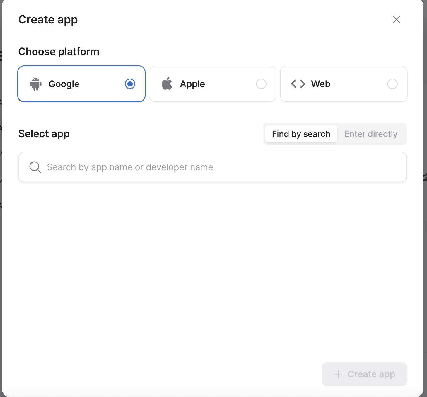 That will lead to the app menu under settings. Choose your platform (iOS, Android, or Web) and search for your app.