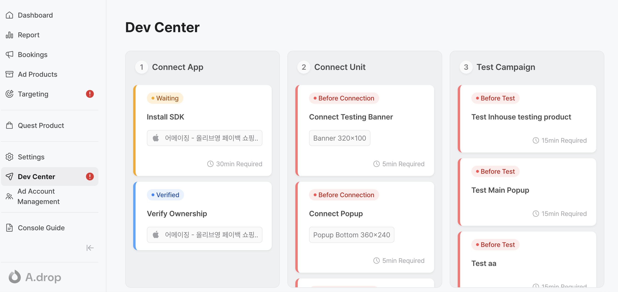 For detailed instructions on running a test campaign, please refer to \[[this guide](https://help.adrop.io/en/developer-center/try-a-test-campaign)].