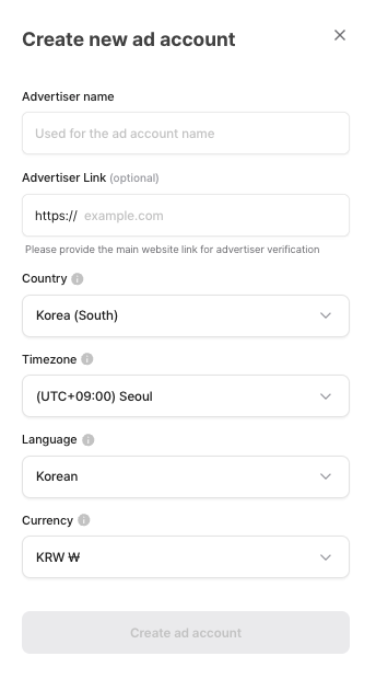 3. Fill advertiser name and add URL of the advertiser. Then, click "Create an Ad Account."