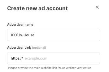1. **In the ‘Advertiser Name’ field, enter names like "XXX In-House Advertising Platform," "\[DEV] XXX," or "XXX In-House" to freely create your in-house advertising accounts.**